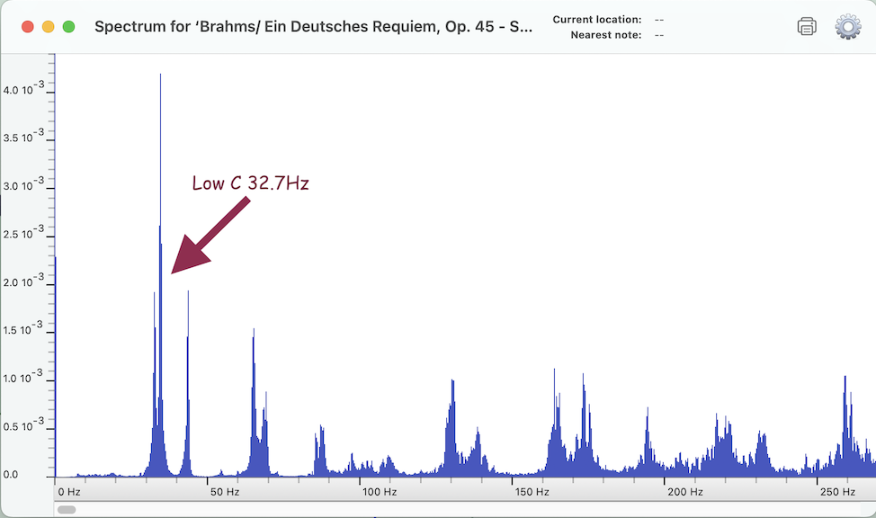 One of my longstanding test tracks for bass extension is the first movement (“Selig sind”) of the Telarc Robert Shaw/Atlanta Symphony Brahms Ein deutsches Requiem. As shown in the Amadeus Pro II Spectrum below, the score calls for organ pedal notes at Low C = 32.7Hz. There’s also a Low F at 43.7Hz.