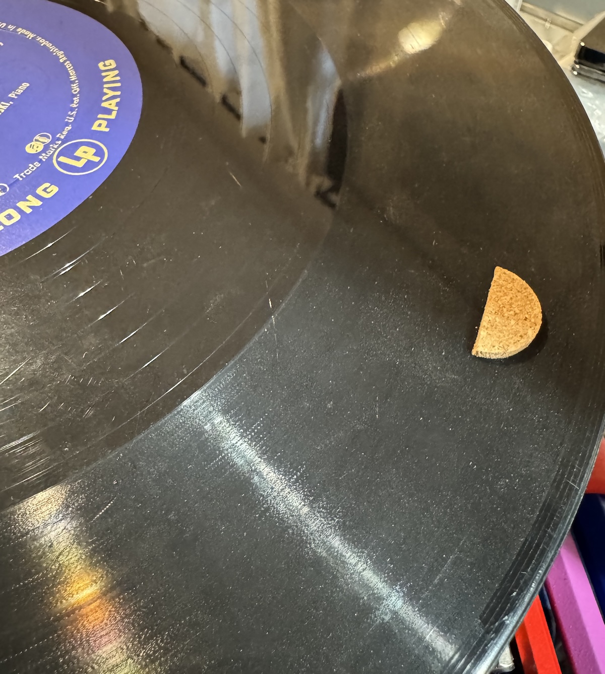 Paul Seydor recently sent me an old record fitted with a wooden dresser knob that makes it even easier to remove and replace the place holder record. He also applied a small cork "mezzaluna" to the contact side, which keeps it from making full platter contact. I guess that's to allow air to circulate? Poor Paul is away on a European river cruise vacation with his family so I can't ask its purpose right now.