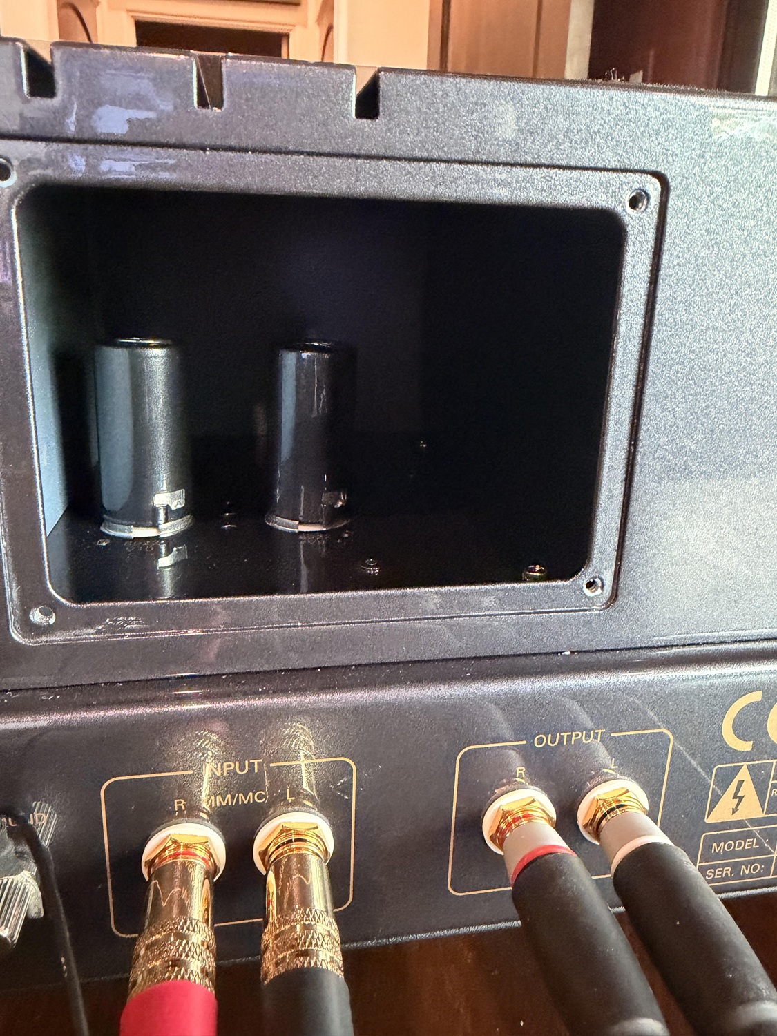 Opening that panel reveals the two MC gain tubes, which are labeled as 6922s. Ok, I can put my socks back on.