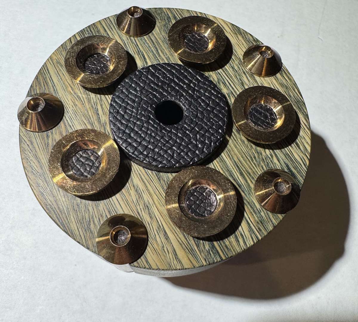 What’s the best weight material? What’s the best weight? What’s the best approach, damping or “tuning”? For decades it’s been based on listening and experimentation. That’s what led to the Shun Mook—a colleted weight made of rare dried ebony briar that in 2021 cost $5600. Not sure what it costs now but it’s a tuning type of weight that resonates at particular frequencies intended to enhance the sound. It’s long considered to be the “brown wood standard” of resonating type record weights.