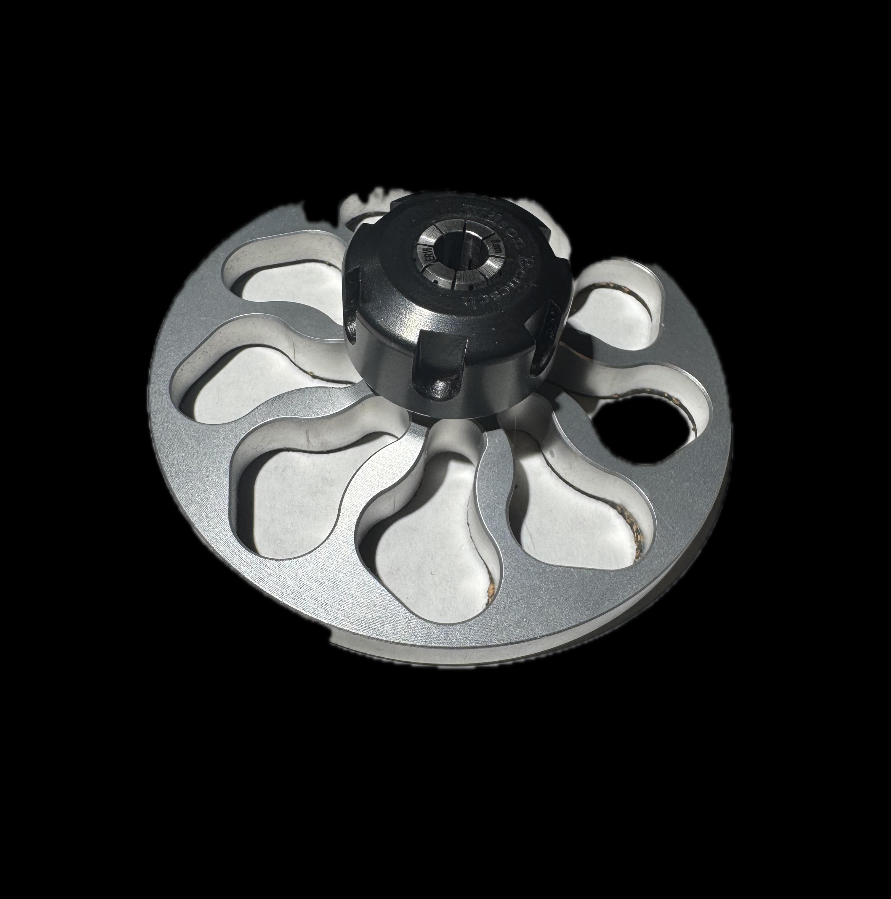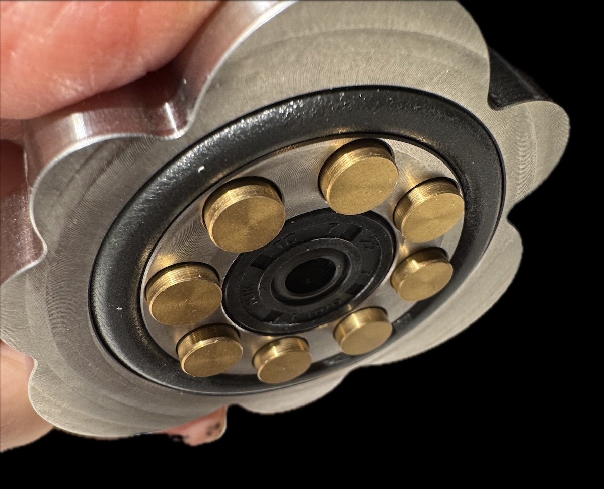 The second design feature deals with spindle resonance measured by the Vibrometer that originate in the bearing system, whether caused by the thrust pad/ball interaction or the bearing sleeve and the spindle itself, or both. The RC Mk3 addresses these measured frequencies using different “tuned materials” (specialized polymers) placed within “purpose designed chambers” located in the clamp’s upper section.