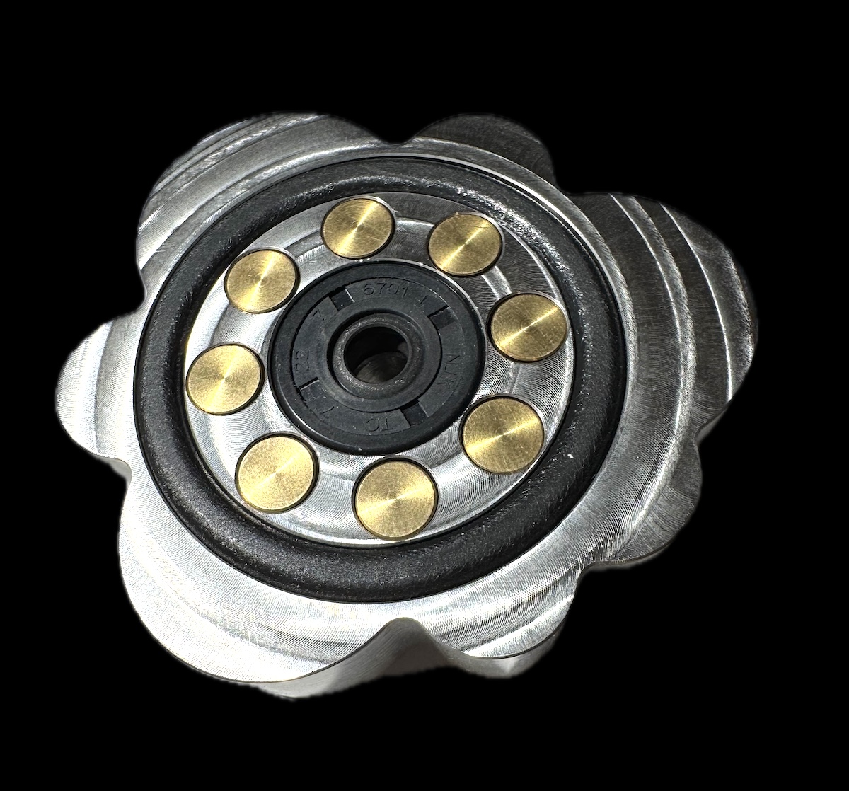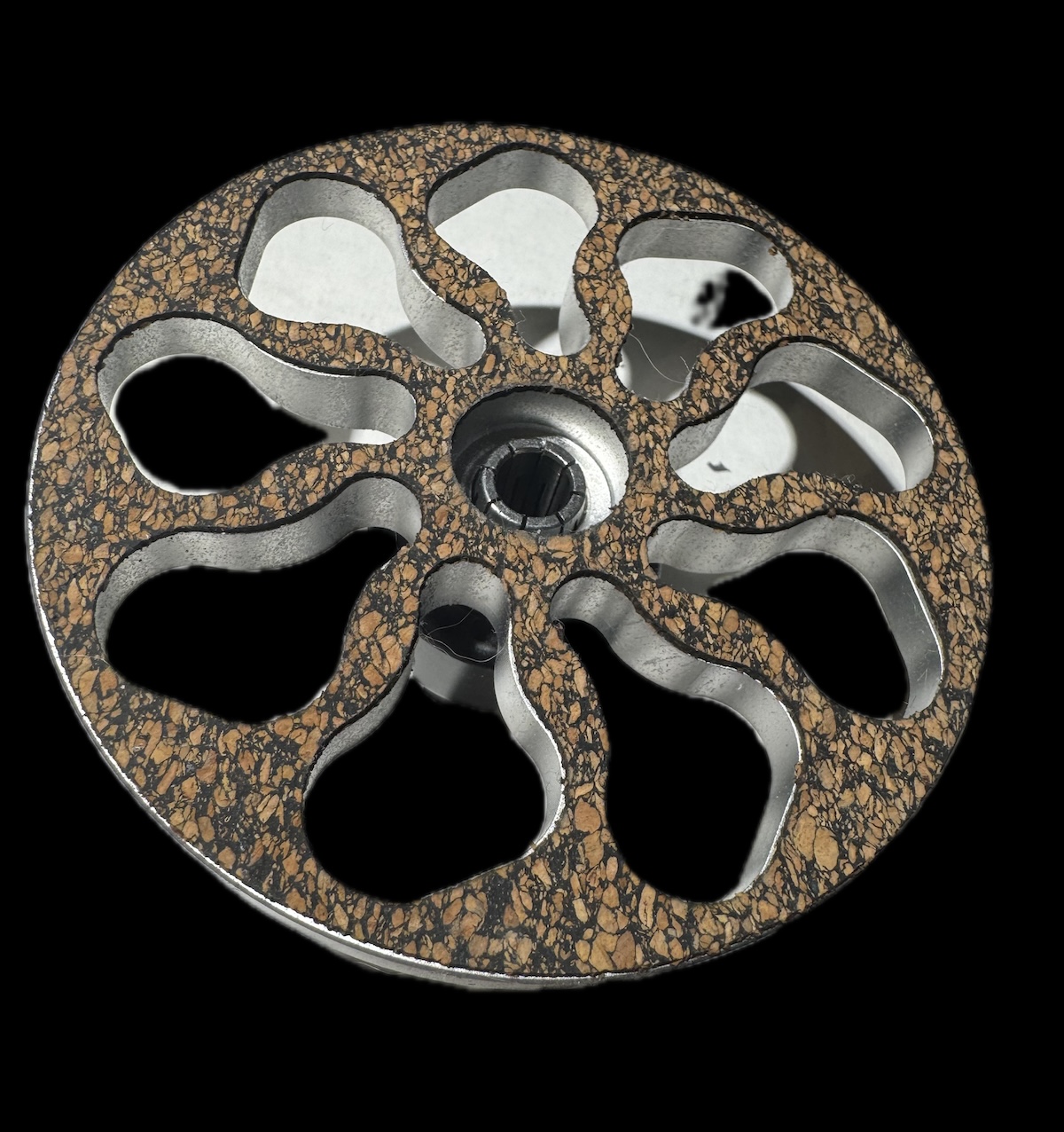 JEWEL is mounted to the spindle via a so-called shaft seal. The unique design of the shaft seal ring ensures a stable connection with the spindle. The elastic coating of the ring neutralizes the vibrations, that might be transmitted via the spindle. At the same time, the expandable NBR rubber coating allows JEWEL to be used on a wide variety of record players with different spindles. The material NBR (nitrile butadiene rubber) is an elastomer with excellent mechanical properties and has high abrasion and tensile strength. There is a coil spring around the center hole inside the shaft seal that serves to additionally stabilize the spindle mount.