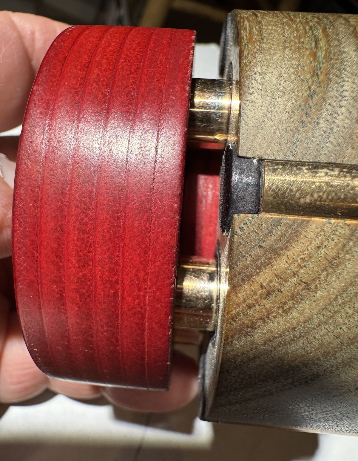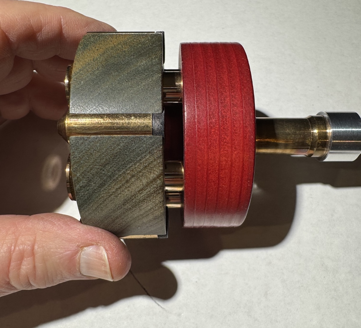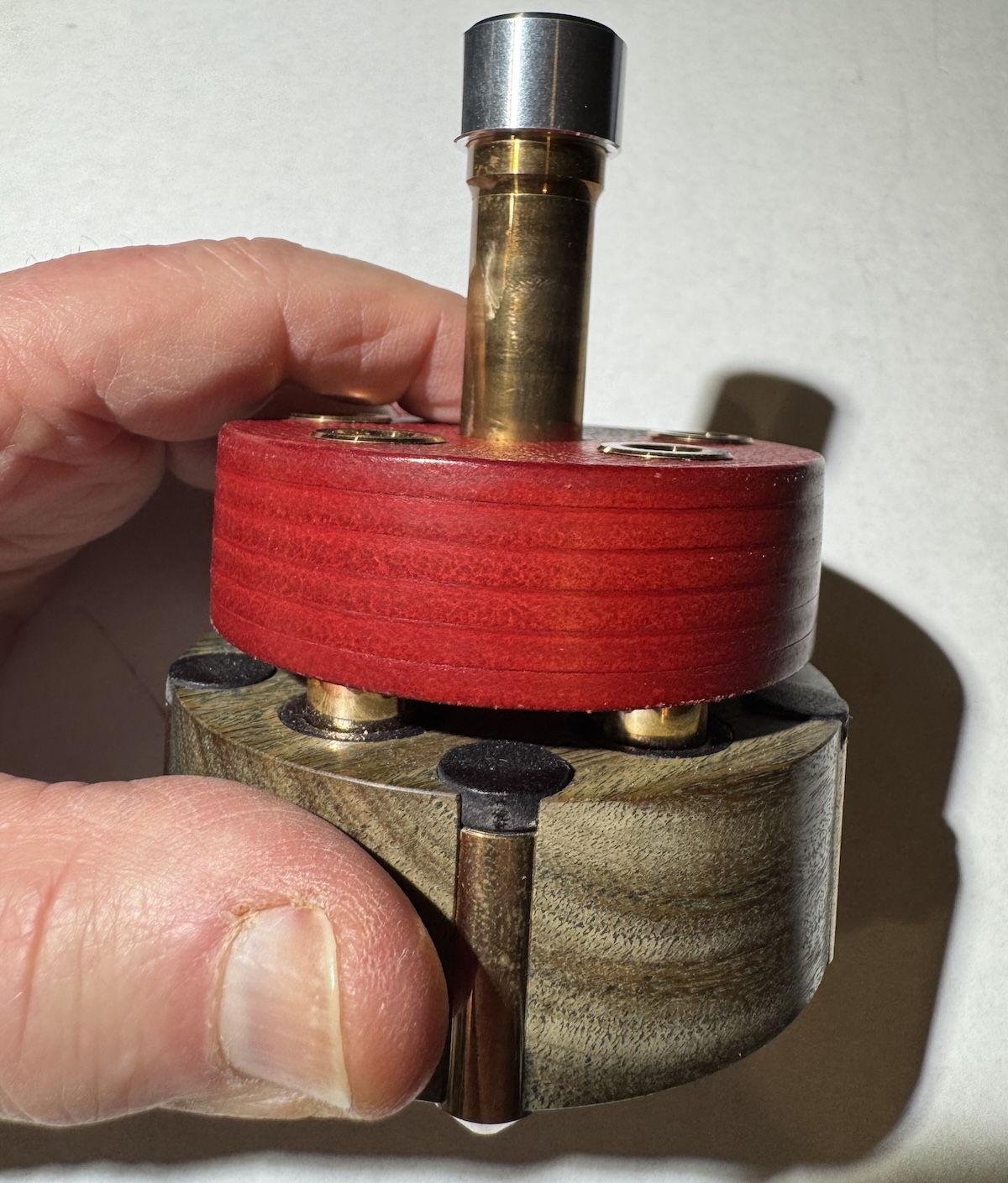 As you can see, the layered red top piece extends below and into an opening in the Verawood base. This is complex design, featuring many components. To use, once you've placed the the weight on the record, you carefully push the brass pin down into the center opening. It's a friction-tight fit requiring some force. It's important, the importer told me, to be sure the pin is pushed all the way down. The amount of force left me vaguely uncomfortable about how good this would be over time for the bearing's thrust pad. I'm sure the Wilson-Benesch Prime Meridian's bearing system can deal with the weight but just know it's a pretty heavy push.
