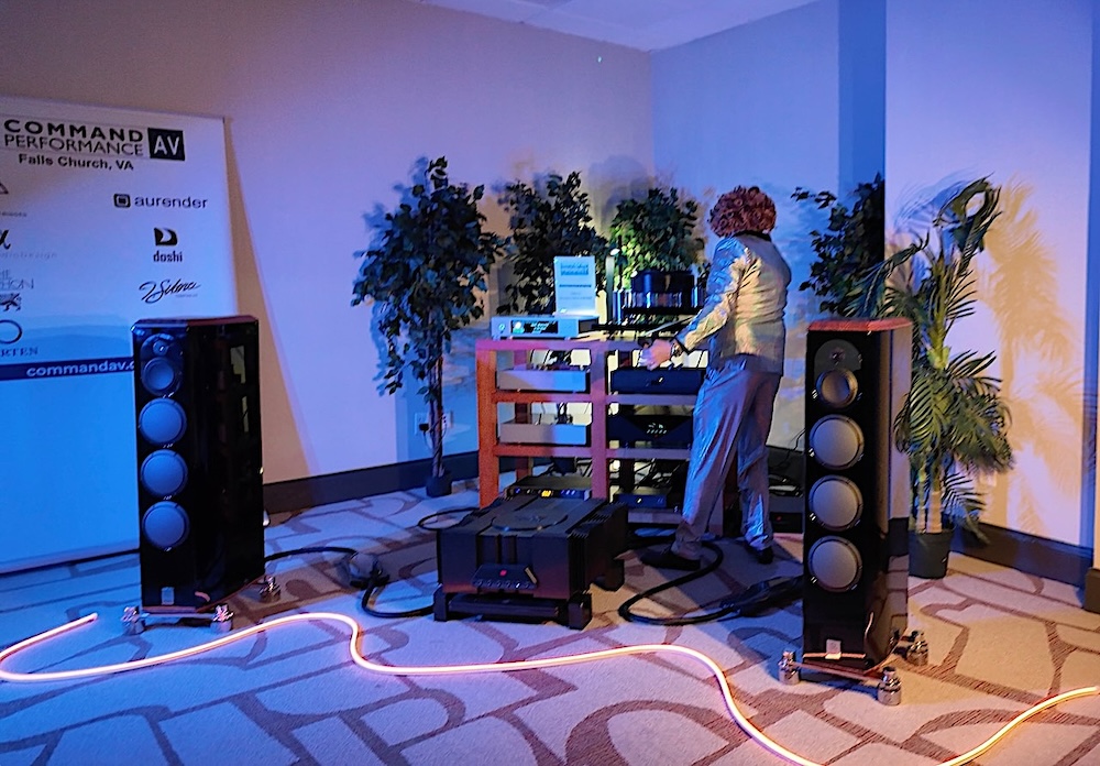 The camera messed up coverage of the Command Performance AV room which celebrated the 70s with silly costumes and some musical presentations including one by my friend Brian Speiser who does the live mixing for the Tedeschi Trucks band. I played an hour's worth of records I brought from home that I won't list here and while the system was having some set up issues on day one, when I returned Sunday to spin it was sounding much better. The system was: J.Sikora Standard MAX SUPREME turntable, with KV MAX 12" arm fitted with Aidas Violet Gold Cartridge LE, Doshi Evo phono preamp, Gryphon Essence Preamp, Gryphon Antileon Revelation stereo amplifier (making its debut I believe), and Martin Mingus Quintet 2 Statement speakers. Also Berkeley Audio DAC and Aurender music server plus Transparent Audio XL series cable.