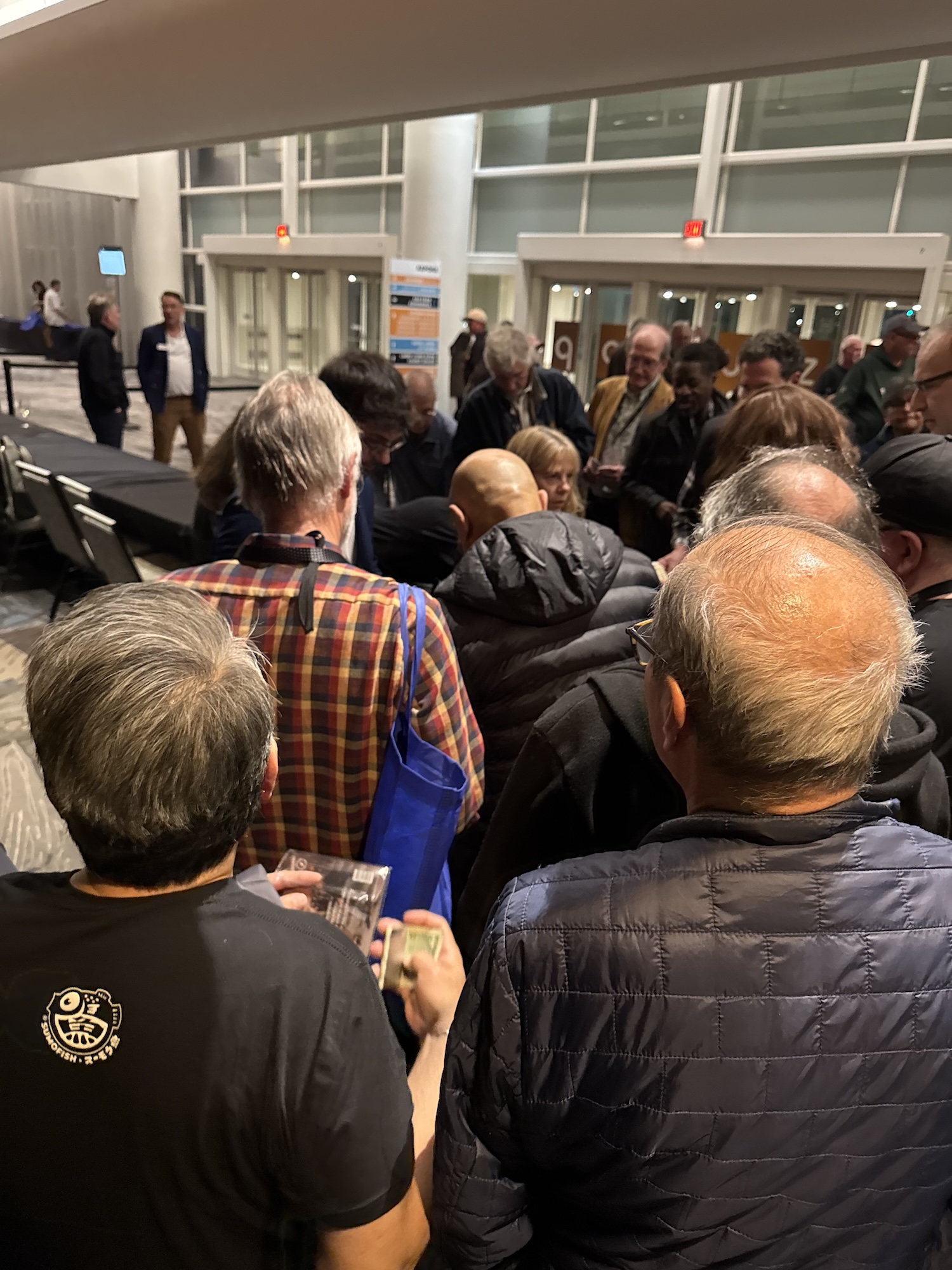 Caelan's trio performed an exciting, high energy concert. The audience reacted as they do at rock shows. There was a crush outside after the show for autographed CDs and vinyl records. Acoustic Sounds distributes the vinyl version and when Chad Kassem saw the people lining up to buy autographed merch he ran back to the Marketplace and brought back a box of LPs. You can see Caelan's head just to the right of the guy wearing the colorful plaid shirt.