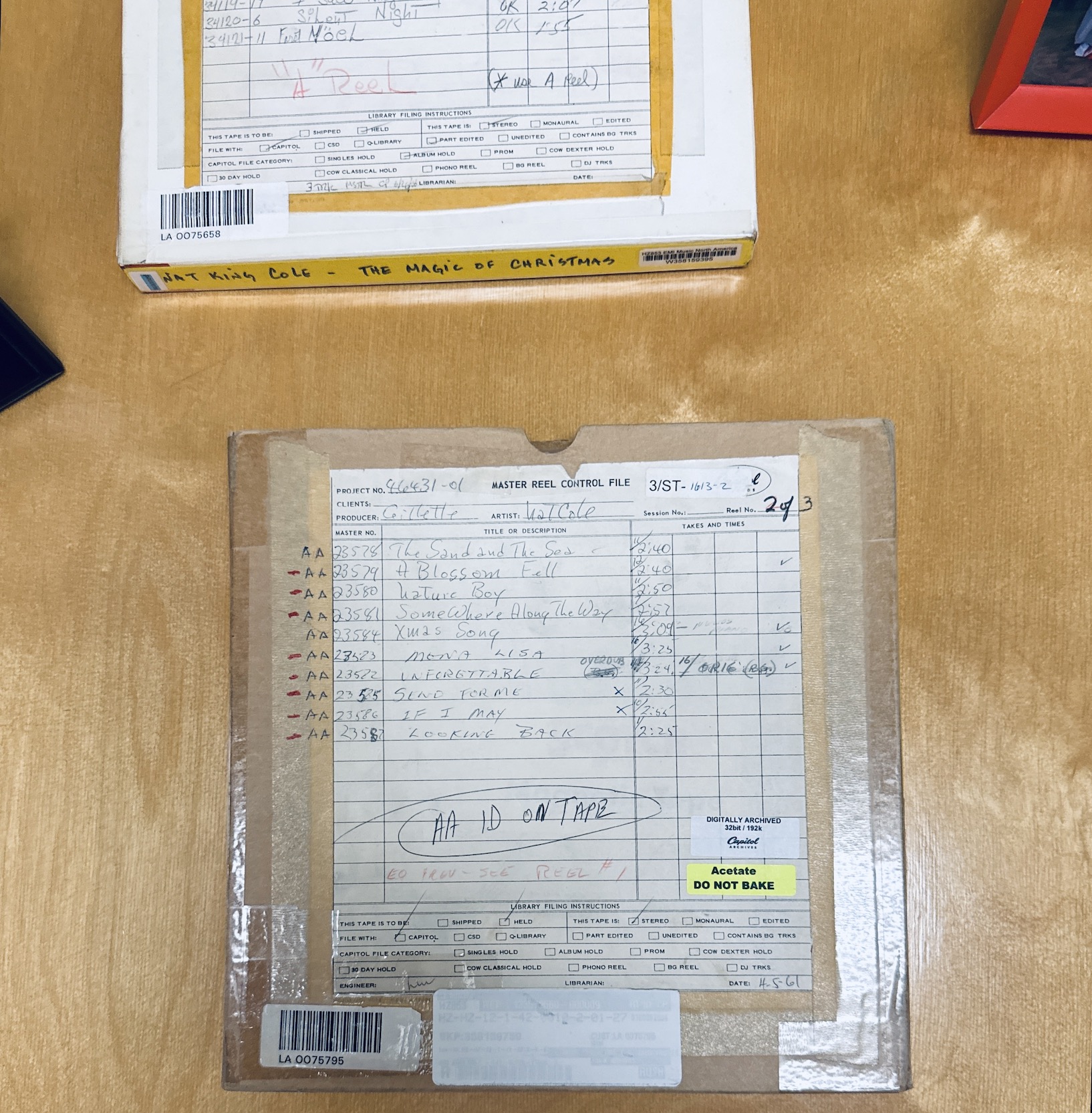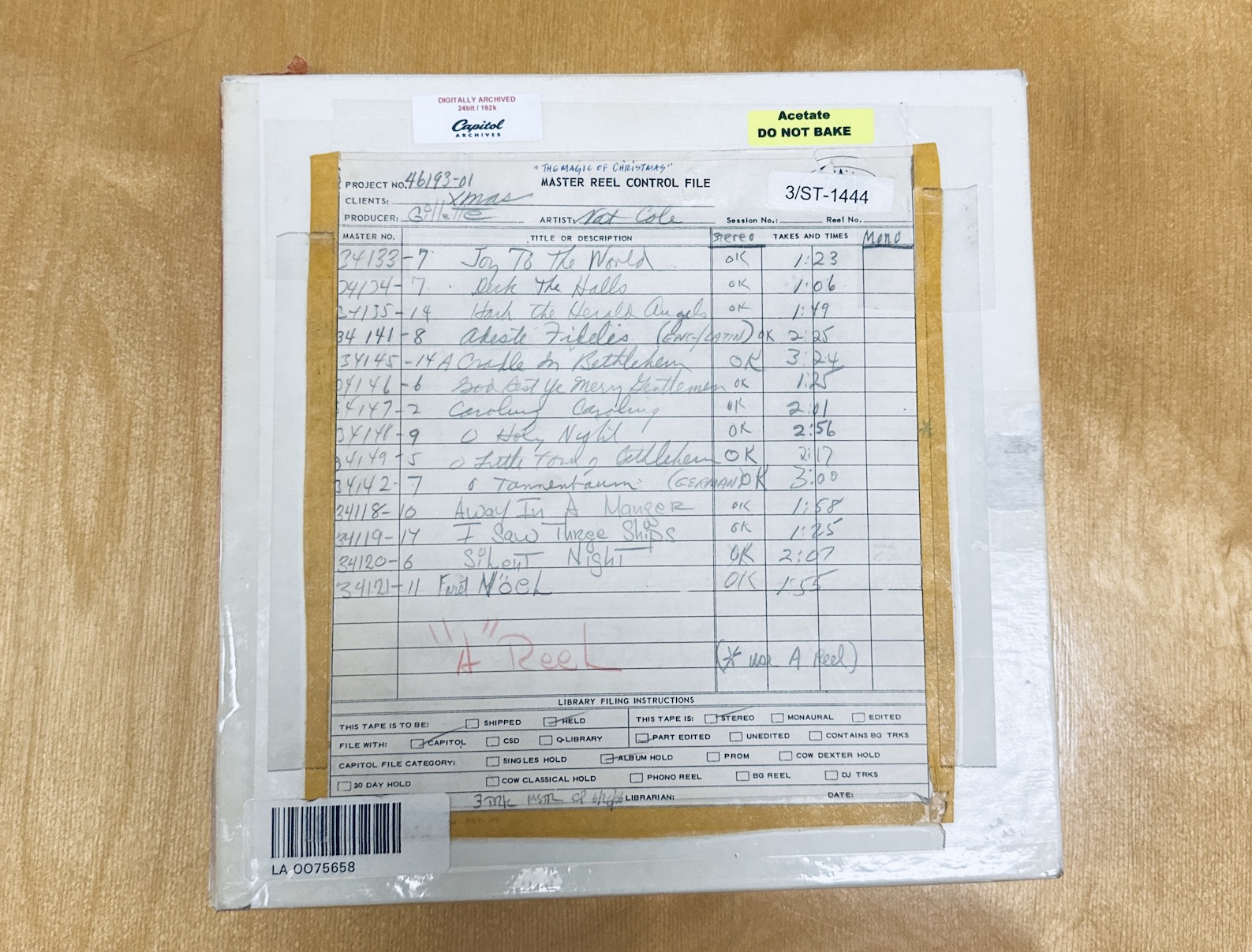 Grover: Most of the songs were there, just not in the order you needed them for The Christmas Song album. Then we have to start weighing out how long is that going to take. Are we even allowed to splice the tapes together to make a cutting version? Then ultimately, I wanted to add two more songs to the album that weren't on the 1962 release. In fact, they've never been on vinyl.
