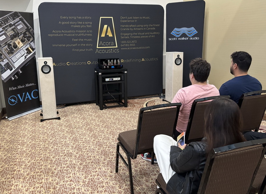 Once the music began, it became evident why the room was drawing so much attention. The system displayed was centered on Acora’s distinctive VRC granite loudspeakers and VAC’s Statement Series tube electronics, a combination that has consistently ranked among the best-sounding systems at Audio Shows over the past number of years.