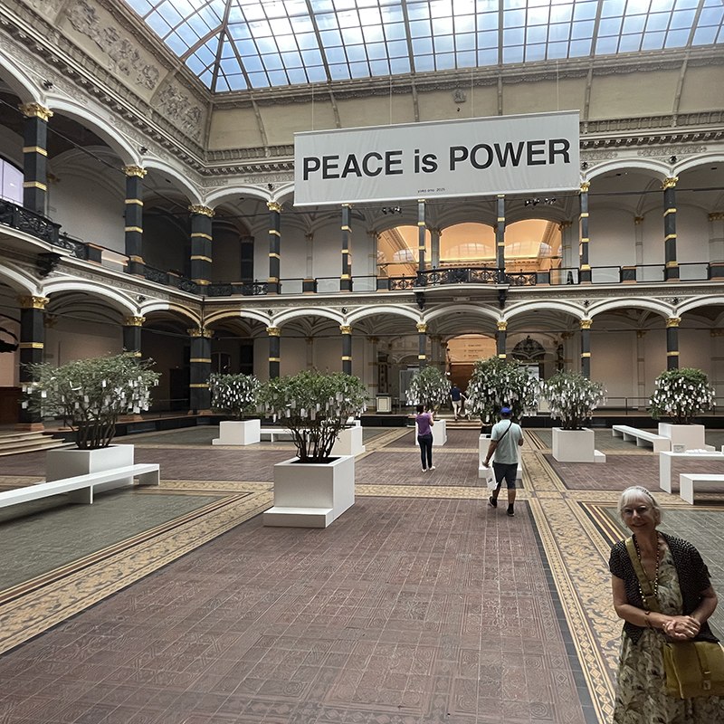 In the courtyard of the Gropius Bau. The installation Wish Tree for Berlin (1996/2025) can be seen in the background. It invited visitors to write their wishes for peace on small pieces of paper and tie them to one of the nine trees.