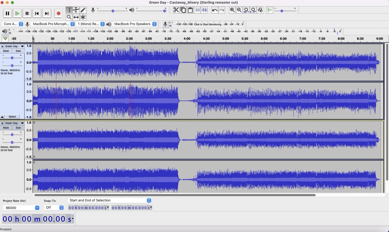 For this 25th anniversary box set pressed at GZ, Chris Bellman mastered and cut the bonus material while Ted Jensen remastered the core album yet again. Joe Nino-Hernes at Sterling cut lacquers for the 25th anniversary album remaster, also available separately on neon orange vinyl. Despite both 2024 and 2025 album cuts coming from Ted Jensen-mastered files, they sound very different. The 25th anniversary is significantly more dynamic; I’m almost certain that Nino-Hernes’ remaster cut was from a dedicated vinyl master (the new digital remaster is just as loud as the previous two digital masters), as it sounds and measures much better. Here are loudness-matched vinyl transfer waveforms for “Castaway” and “Misery,” with the new Sterling remaster on the top and the Bellman cut below it. You can tell that Bellman cut his version from a compressed brick: