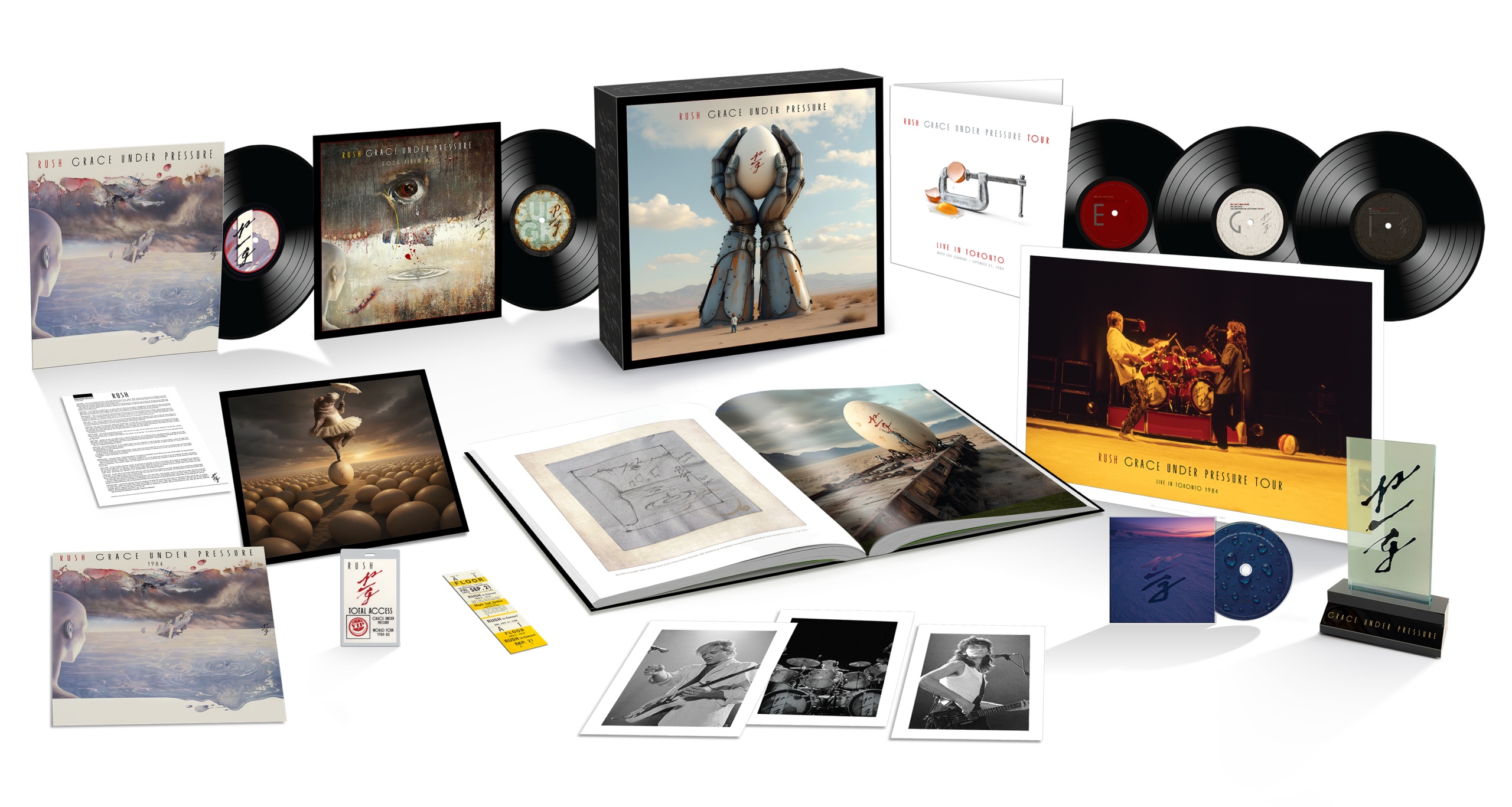 Grace Under Pressure is the sixth Rush album since 1976’s 2112 to receive a lavish super deluxe box set. Despite missing its 40th anniversary two years prior, it’s better late than never. The box set features a newly designed cover by Rush’s long-standing art director, Hugh Syme, with spot varnish elements against a matte soft-touch coating; it’s best to wear ‘kid gloves’ while handling it (if you know, you know!). A 52-page hardcover book features liner notes from Geddy Lee, new illustrations for each of the album’s lyrics, and previously unseen live photos. There’s also an envelope that houses lithographs, a poster, and all the fathomable bits of replica memorabilia (a tour program, a concert ticket, a backstage pass, and a press release). Each LP jacket is presented in sturdy tip-on jackets, once again with spot varnish elements, and the LPs are appropriately housed in poly-lined inners. To top it off, the most absurd yet borderline-cool feature is an acrylic LED light-up display of the album’s abbreviated symbol; does anybody need a night light?